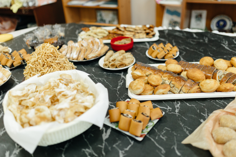 Необычным щедрым было угощение от скатерти-самобранки: гостей ждали русские блины, хворост, тюркские баурсаки, чак-чак, кузикмяк и плов, бурятские банши, удмуртские перепечи и кожыпог, цыганская сывьяко и другие национальные блюда.