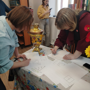 В русской светёлке гостям были представлены живописные головоломки Д. Ельцевой, в которых зашифрованы различные крылатые выражения, хранящие народную мудрость. Интересно было разгадать диалекты из глубинок нашей родины, посоревноваться в быстроте с палкой-моталкой. Увлеклись хозяюшки рукоделием в творческой мастерской «Лоскутные мотивы». Яркие прихватки в русском стиле будут напоминать о душевной встрече.