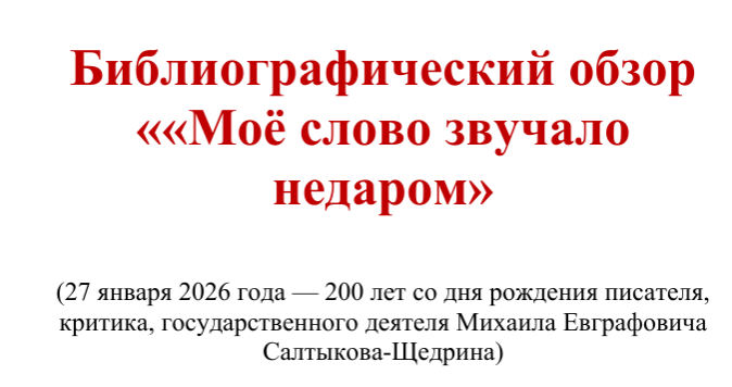Уважаемые читатели! Предлагаем познакомиться с блиографическим обзором литературы к 200-летию со дня рождения русского писателя, публициста Михаила Салтыкова-Щедрина «Моё слово звучало недаром». 12+