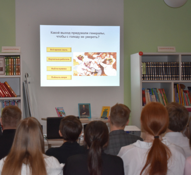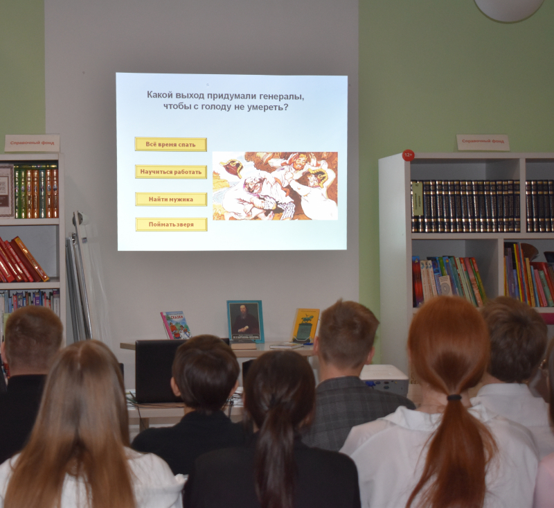 Любители литературы приняли участие в викторине по сказке «Повесть о том, как один мужик двух генералов прокормил». Отвечая на вопросы, учащиеся проследили зависимость бездельников от трудолюбивого и умелого человека.